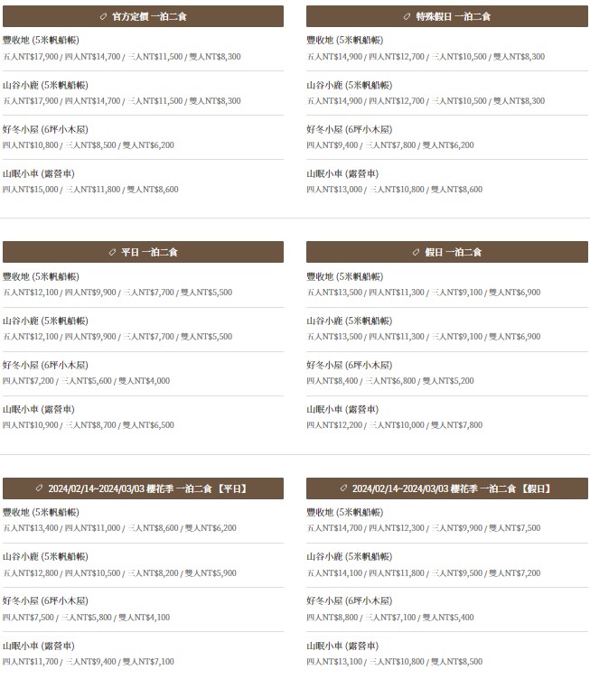 - 山峰小徑:6頂帳篷樹立在樹林間,房內有2張標準雙人床、1張沙發床、電毯、除濕機、電扇等設備,距離櫻花林約5分鐘的距離,夏天時欣賞綠蔭的樹木,春天欣賞園區的櫻花。適合親朋好友、團體旅遊包區一同享樂。